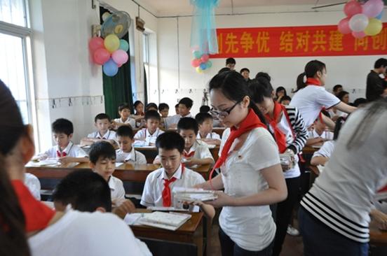 共青團(tuán)員向少先隊員贈送筆記本與筆