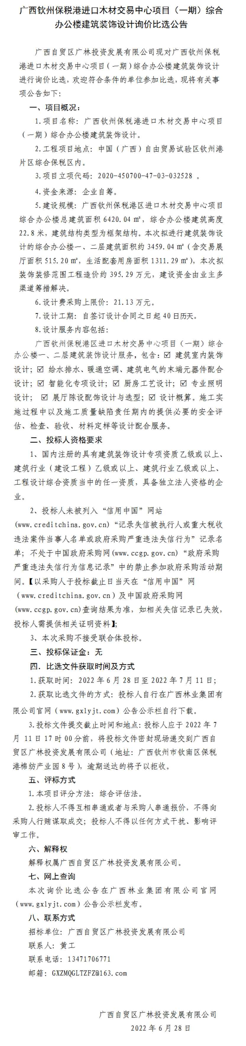 廣西欽州保稅港進口木材交易中心項目(一期)綜合辦公樓建筑裝飾設計詢價比選公告